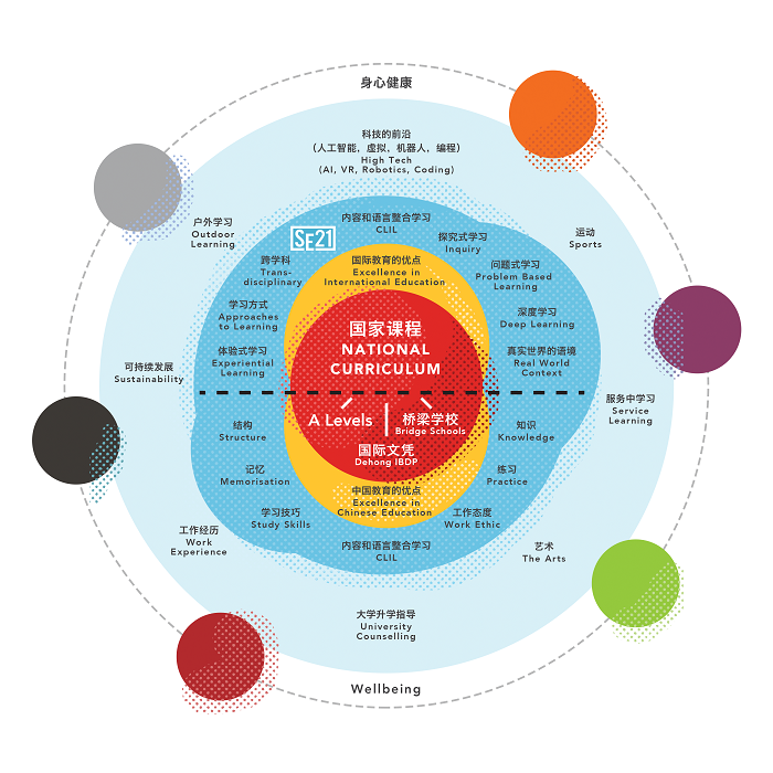 在教授备受认可的中国国家义务制课程过程中,我们在一部分科目中采用中文作为授课语言,在另外一部分科目中采用英文作为授课语言。在我们延展出来的课程中,采用探究式的学习方法,跨学科的学习方式。这样的设计能够帮助丰富和加深学生们关于自我、文化和周边世界的学习,这包括STEAM、SE21、服务、可持续发展和文化活动。