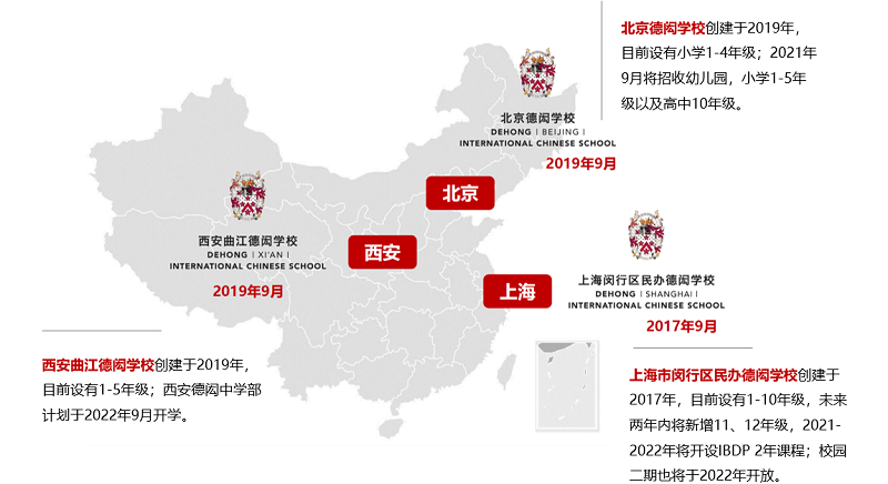 目前,德闳教育在上海、北京和西安先后成立了三所学校。上海闵行区民办德闳学校成立于2017年;北京德闳学校与西安曲江德闳学校成立于2019年。