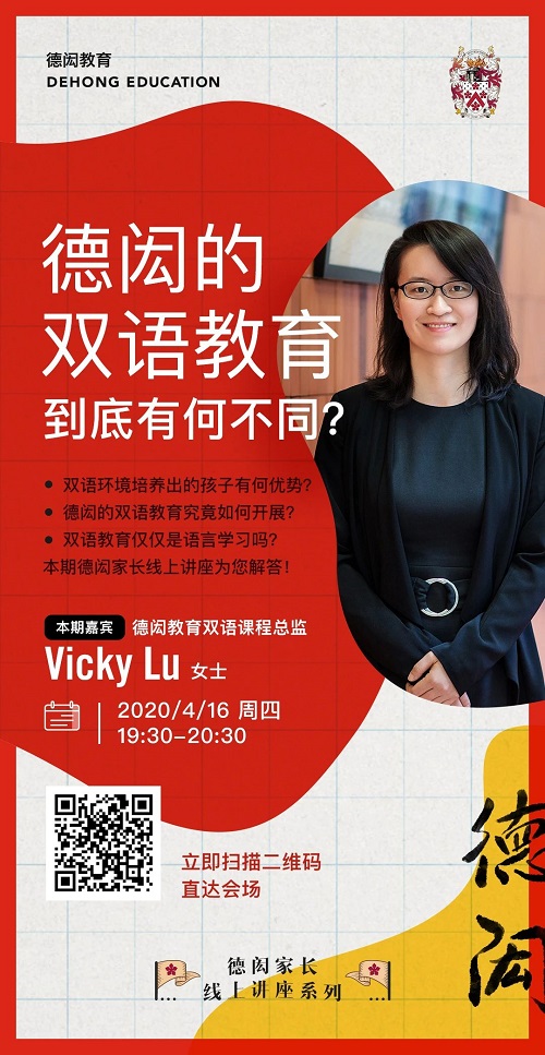 我们将再次迎来三校联动德闳家长线上讲座,德闳教育双语课程总监Vicky Lu女士,将为您分享: